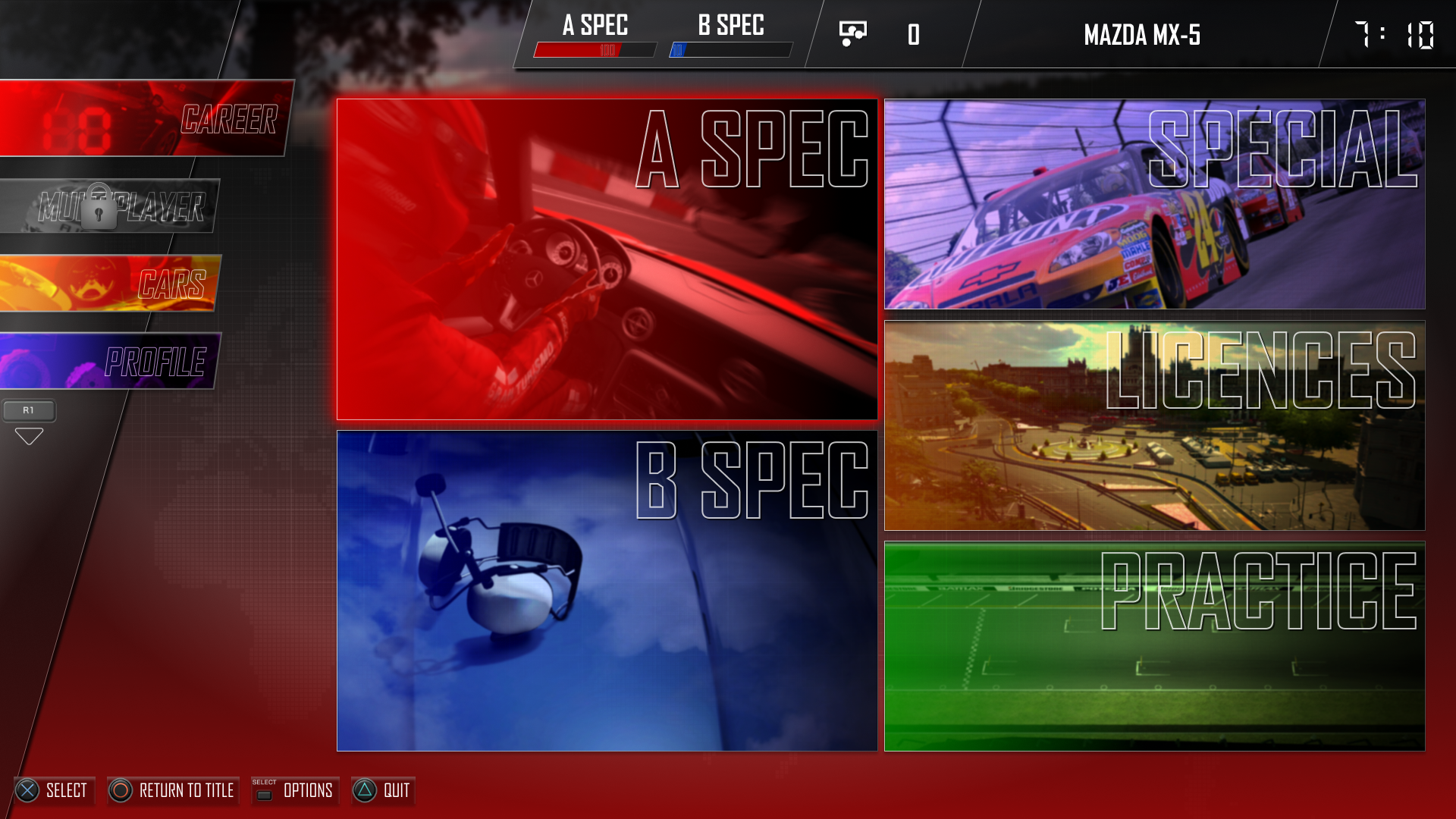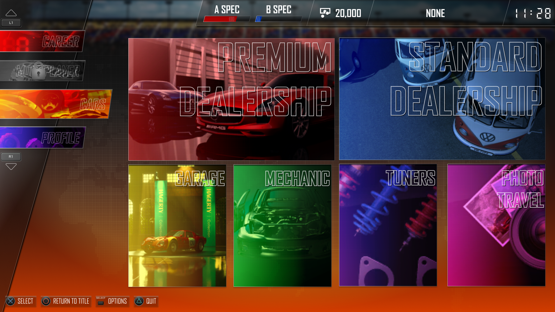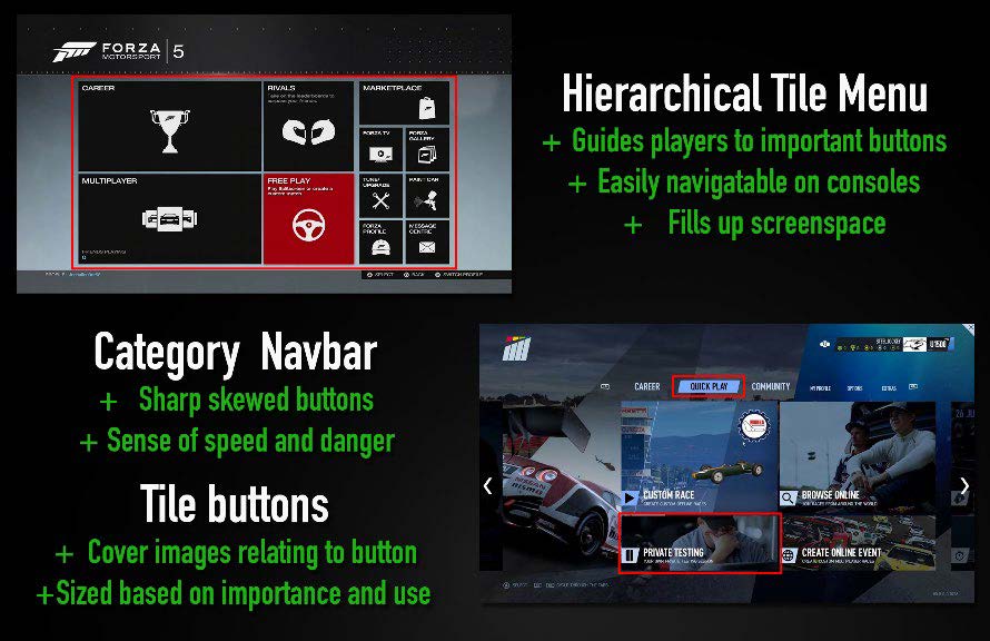 - Forza Motorsport 5 - clean grid-based tile menu with clear visual cues