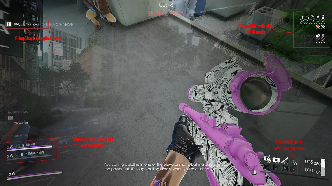 A mod that enhances the default HUD by adding detailed crew status, ammo counters, equipment indicators, and dynamic portraits. This is currently one of the only Payday 3 HUD mods and is one of the most popular mods in the game (as of typing this).